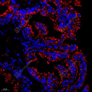 IF检测NBR1蛋白(货号 GB11788)(红色). 样品: 人前列腺, 4%多聚甲醛 (货号G1101) 固定12-24小时. 抗原修复: Tris-EDTA抗原修复液(pH 9.0) (G1203), 98℃, 20分钟. 封闭: 3% BSA(货号GC305010)的PBS溶液, 室温孵育30分钟. —抗: 1: 500稀释, 4℃ 孵育过夜. 二抗: Cy3标记山羊抗兔IgG (H+L) (货号GB21303), 1: 300稀释, 室温孵育1小时. |