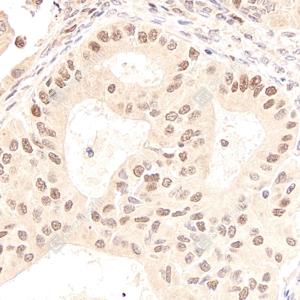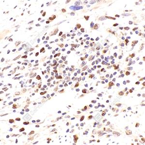 IHC检测Histone H1. 2蛋白(货号 GB115296). 样品: 人结肠癌, 4%多聚甲醛 (货号G1101) 固定12-24小时. 抗原修复: Tris-EDTA抗原修复液(pH 9.0) (G1203), 98℃, 20分钟. —抗: 1: 800稀释, 4℃ 孵育过夜. 二抗: HRP标记山羊抗兔IgG (H+L) (货号GB23303), 1: 200稀释, 室温孵育1小时. |