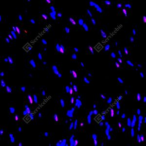 IF检测SOCS7蛋白(货号 GB111760)(红色). 样品: 大鼠心, 4%多聚甲醛 (货号G1101) 固定12-24小时. 抗原修复: Tris-EDTA抗原修复液(pH 9.0) (G1203), 98℃, 20分钟. 封闭: 3% BSA(货号GC305010)的PBS溶液, 室温孵育30分钟. —抗: 1: 650稀释, 4℃ 孵育过夜. 二抗: Cy3标记山羊抗兔IgG (H+L) (货号GB21303), 1: 300稀释, 室温孵育1小时. |
