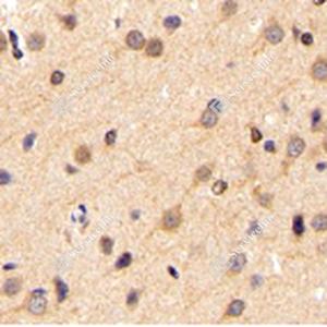 IHC检测FOXO1蛋白(货号 GB11286-1). 样品: 大鼠脑, 4%多聚甲醛 (货号G1101) 固定12-24小时. 抗原修复: 柠檬酸抗原修复液(干粉, pH 6.0) (G1201), 98℃, 20分钟. —抗: 1: 800稀释, 4℃ 孵育过夜. 二抗: HRP标记山羊抗兔IgG (H+L) (货号GB23303), 1: 200稀释, 室温孵育1小时. |