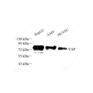 WB检测YAP1蛋白(货号 GB11542). 样品: 经RIPA裂解液(货号G2002)处理的蛋白质. 封闭: 封闭: 3%脱脂牛奶(货号GC310001)溶于TBST溶液, 室温孵育1小时. —抗: 1: 500稀释, 4℃ 孵育过夜. 二抗: HRP标记山羊抗兔IgG (H+L) (货号GB23303), 1: 5000稀释, 室温孵育1小时. |