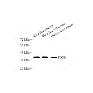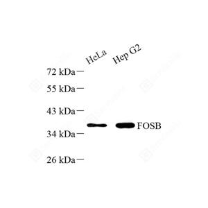WB检测Fos B蛋白(货号 GB11270). 样品: 经RIPA裂解液(货号G2002)处理的蛋白质. 封闭: 封闭: 3%脱脂牛奶(货号GC310001)溶于TBST溶液, 室温孵育1小时. —抗: 1: 500稀释, 4℃ 孵育过夜. 二抗: HRP标记山羊抗兔IgG (H+L) (货号GB23303), 1: 5000稀释, 室温孵育1小时. |