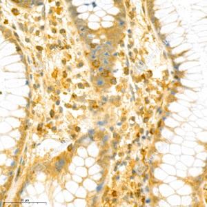 IHC检测PTPN12蛋白(货号 GB111076). 样品: 人结肠, 4%多聚甲醛 (货号G1101) 固定12-24小时. 抗原修复: 柠檬酸抗原修复液(干粉, pH 6.0) (G1201), 98℃, 20分钟. —抗: 1: 2500稀释, 4℃ 孵育过夜. 二抗: HRP标记山羊抗兔IgG (H+L) (货号GB23303), 1: 200稀释, 室温孵育1小时. |