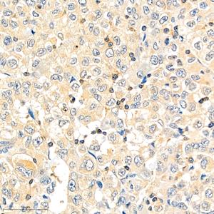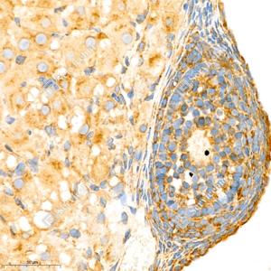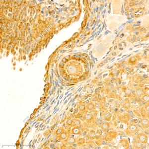IHC检测PTPN12蛋白(货号 GB111076). 样品: 小鼠卵巢, 4%多聚甲醛 (货号G1101) 固定12-24小时. 抗原修复: 柠檬酸抗原修复液(干粉, pH 6.0) (G1201), 98℃, 20分钟. —抗: 1: 1250稀释, 4℃ 孵育过夜. 二抗: HRP标记山羊抗兔IgG (H+L) (货号GB23303), 1: 200稀释, 室温孵育1小时. |