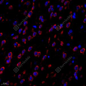 IF检测PTPN12蛋白(货号 GB111076)(红色). 样品: 小鼠脑, 4%多聚甲醛 (货号G1101) 固定12-24小时. 抗原修复: Tris-EDTA抗原修复液(pH 9.0) (G1203), 98℃, 20分钟. 封闭: 3% BSA(货号GC305010)的PBS溶液, 室温孵育30分钟. —抗: 1: 1000稀释, 4℃ 孵育过夜. 二抗: Cy3标记山羊抗兔IgG (H+L) (货号GB21303), 1: 300稀释, 室温孵育1小时. |