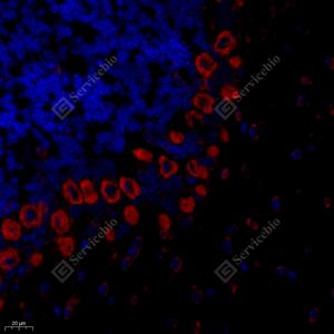 IF检测PTPN12蛋白(货号 GB111076)(红色). 样品: 小鼠小脑, 4%多聚甲醛 (货号G1101) 固定12-24小时. 抗原修复: Tris-EDTA抗原修复液(pH 9.0) (G1203), 98℃, 20分钟. 封闭: 3% BSA(货号GC305010)的PBS溶液, 室温孵育30分钟. —抗: 1: 1000稀释, 4℃ 孵育过夜. 二抗: Cy3标记山羊抗兔IgG (H+L) (货号GB21303), 1: 300稀释, 室温孵育1小时. |