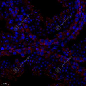 IF检测PTPN12蛋白(货号 GB111076)(红色). 样品: 小鼠睾丸, 4%多聚甲醛 (货号G1101) 固定12-24小时. 抗原修复: Tris-EDTA抗原修复液(pH 9.0) (G1203), 98℃, 20分钟. 封闭: 3% BSA(货号GC305010)的PBS溶液, 室温孵育30分钟. —抗: 1: 1000稀释, 4℃ 孵育过夜. 二抗: Cy3标记山羊抗兔IgG (H+L) (货号GB21303), 1: 300稀释, 室温孵育1小时. |