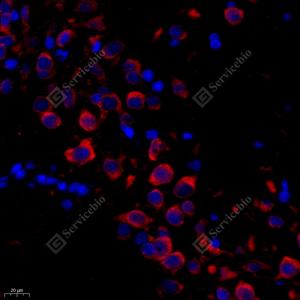 IF检测PTPN12蛋白(货号 GB111076)(红色). 样品: 小鼠卵巢, 4%多聚甲醛 (货号G1101) 固定12-24小时. 抗原修复: Tris-EDTA抗原修复液(pH 9.0) (G1203), 98℃, 20分钟. 封闭: 3% BSA(货号GC305010)的PBS溶液, 室温孵育30分钟. —抗: 1: 1000稀释, 4℃ 孵育过夜. 二抗: Cy3标记山羊抗兔IgG (H+L) (货号GB21303), 1: 300稀释, 室温孵育1小时. |