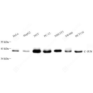 | WB检测c-Jun蛋白(货号 GB111604). 样品: 经RIPA裂解液(货号G2002)处理的蛋白质. 封闭: 封闭: 3%脱脂牛奶(货号GC310001)溶于TBST溶液, 室温孵育1小时. —抗: 1: 500稀释, 4℃ 孵育过夜. 二抗: HRP标记山羊抗兔IgG (H+L) (货号GB23303), 1: 5000稀释, 室温孵育1小时. |