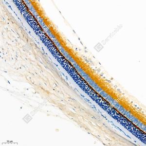 | IHC检测EMP-1蛋白(货号 GB112009). 样品: 小鼠眼球, 4%多聚甲醛 (货号G1101) 固定12-24小时. 抗原修复: 柠檬酸抗原修复液(干粉, pH 6.0) (G1201), 98℃, 20分钟. —抗: 1: 300稀释, 4℃ 孵育过夜. 二抗: HRP标记山羊抗兔IgG (H+L) (货号GB23303), 1: 200稀释, 室温孵育1小时. |