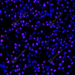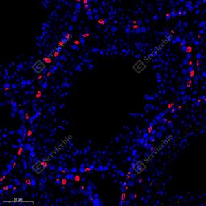 IF检测PPP4R2蛋白(货号 GB112172)(红色). 样品: 小鼠睾丸, 4%多聚甲醛 (货号G1101) 固定12-24小时. 抗原修复: Tris-EDTA抗原修复液(pH 9.0) (G1203), 98℃, 20分钟. 封闭: 3% BSA(货号GC305010)的PBS溶液, 室温孵育30分钟. —抗: 1: 1000稀释, 4℃ 孵育过夜. 二抗: Cy3标记山羊抗兔IgG (H+L) (货号GB21303), 1: 300稀释, 室温孵育1小时. |