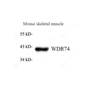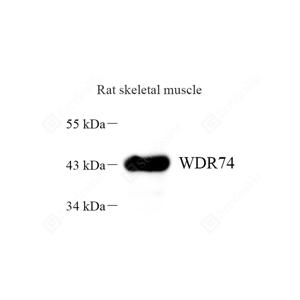 WB检测WDR74蛋白(货号 GB112688). 样品: 经RIPA裂解液(货号G2002)处理的蛋白质. 封闭: 封闭: 3%脱脂牛奶(货号GC310001)溶于TBST溶液, 室温孵育1小时. —抗: 1: 1000稀释, 4℃ 孵育过夜. 二抗: HRP标记山羊抗兔IgG (H+L) (货号GB23303), 1: 5000稀释, 室温孵育1小时. |