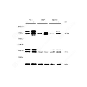 ERK1 and ERK2 belongs to the protein kinase superfamily. It is involved in both the initiation and regulation of meiosis, mitosis, and postmitotic functions in differentiated cells by phosphorylating a number of transcription factors such as ELK-1. ERK1/2 catalized the reaction: ATP + a protein = ADP + a phosphoprotein. It is activated by tyrosine phosphorylation in response to INS and NGF. This antibody can recognize both ERK1 and ERK2 with the molecular mass of 38-44 kDa.