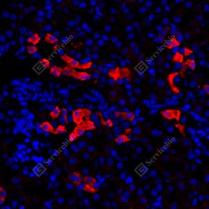 IF检测PTPRK蛋白(货号 GB114078)(红色). 样品: 小鼠肾, 4%多聚甲醛 (货号G1101) 固定12-24小时. 抗原修复: Tris-EDTA抗原修复液(pH 9.0) (G1203), 98℃, 20分钟. 封闭: 3% BSA(货号GC305010)的PBS溶液, 室温孵育30分钟. —抗: 1: 1000稀释, 4℃ 孵育过夜. 二抗: Cy3标记山羊抗兔IgG (H+L) (货号GB21303), 1: 300稀释, 室温孵育1小时. |