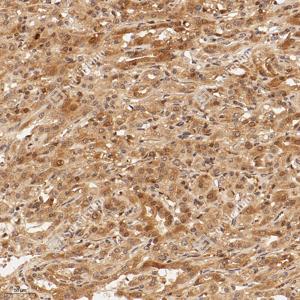 IHC检测VRK2蛋白(货号 GB115086). 样品: 人肾癌, 4%多聚甲醛 (货号G1101) 固定12-24小时. 抗原修复: Tris-EDTA抗原修复液(pH 9.0) (G1203), 98℃, 20分钟. —抗: 1: 600稀释, 4℃ 孵育过夜. 二抗: HRP标记山羊抗兔IgG (H+L) (货号GB23303), 1: 200稀释, 室温孵育1小时. |
