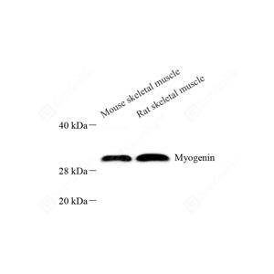 WB检测Myogenin蛋白(货号 GB12988). 样品: 经RIPA裂解液(货号G2002)处理的蛋白质. 封闭: 3%脱脂牛奶(货号GC310001)溶于TBST溶液, 室温孵育1小时. —抗: 1: 500稀释, 4℃ 孵育过夜. 二抗: HRP标记山羊抗小鼠IgG (H+L) (货号GB23301), 1: 5000稀释, 室温孵育1小时. |